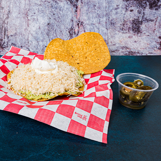 Tostada siberia con base de aguacate, pollo desmenuzado y crema