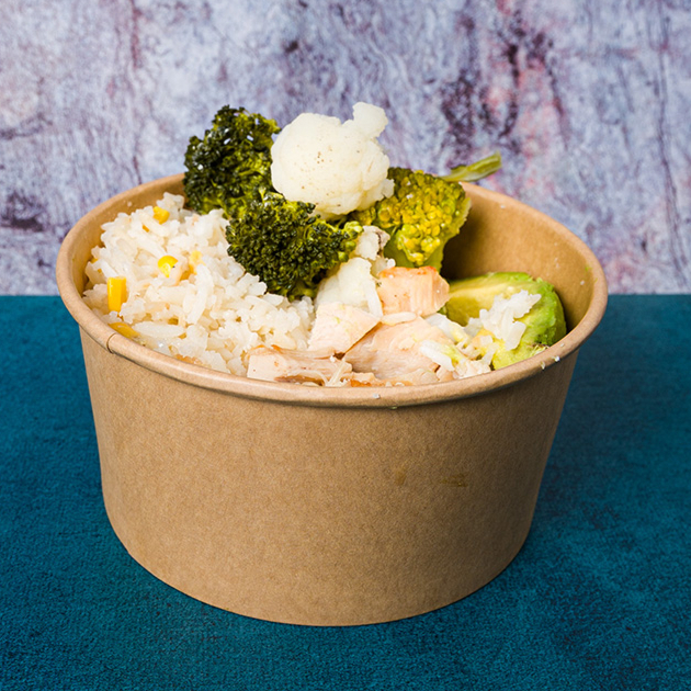 Delicioso bowl preparado con pollo al horno jugoso, acompañado de aguacate fresco, elote dulce, brócoli, coliflor, servido sobre una base de arroz blanco esponjoso. Una opción nutritiva, balanceada y llena de sabor ideal para consentirte de manera saludable. 🌱