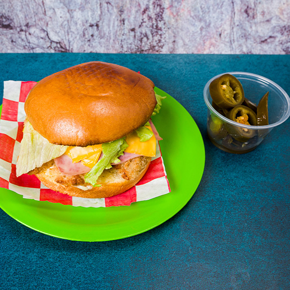Hamburguesa sencilla con pollo empanizado, queso americano, lechuga, mayonesa, cebolla, tomate y aguacate