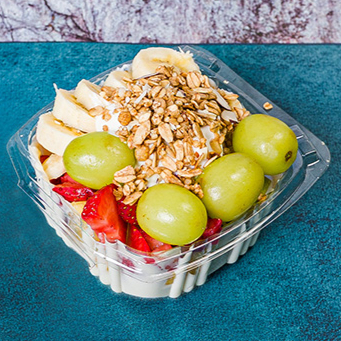 Una combinación fresca y colorida de manzana, melón, piña, fresa y uva, servida con cremoso yogurt griego y un toque crujiente de granola. ideal para empezar el día o como snack saludable y lleno de energía.