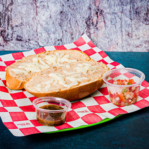 Pan francés suave y doradito, con una base de mayonesa, frijoles refritos y queso oaxaca derretido.