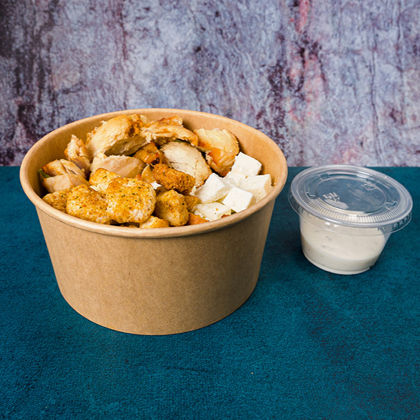 Mezcla de lechugas, trocitos de pollo a la plancha, crutones, jamon, queso panela y queso parmesano con aderezo césar.