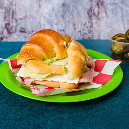 Croissant relleno de jamón de pechuga de pavo y queso, aguacate y mayonesa, excelente combinación de sabores.