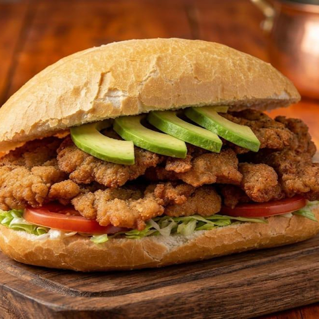 MILANEZA DE RES EMPANIZADA, MAYONESA, QUESO CANASTO, AGUACATE, TOMATE, CEBOLLA, LECHUGA O FRIJOLES REFRITOS, ACOMPAÑADA DE SALSA Y CHILE EN VINAGRE