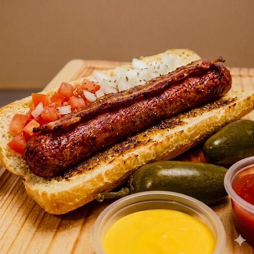PAN JUMBO SALCHICHA, TOCINO, MAYONESA, ACOMPAÑADO DE CHILES EN VINAGRE, TOMATE Y CEBOLLA PICADA