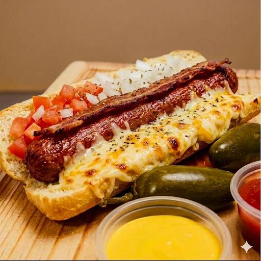 PAN JUMBO SALCHICHA, TOCINO, QUESO, MAYONESA, ACOMPAÑDO DE CHILES EN VINAGRE, TOMATE Y CEBOLLA PICADA