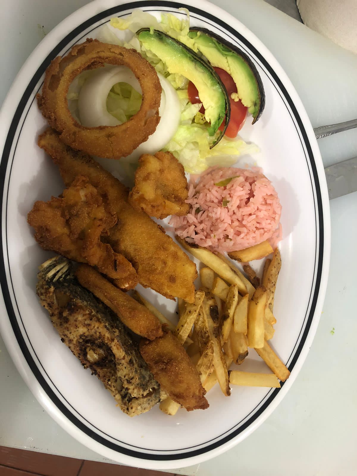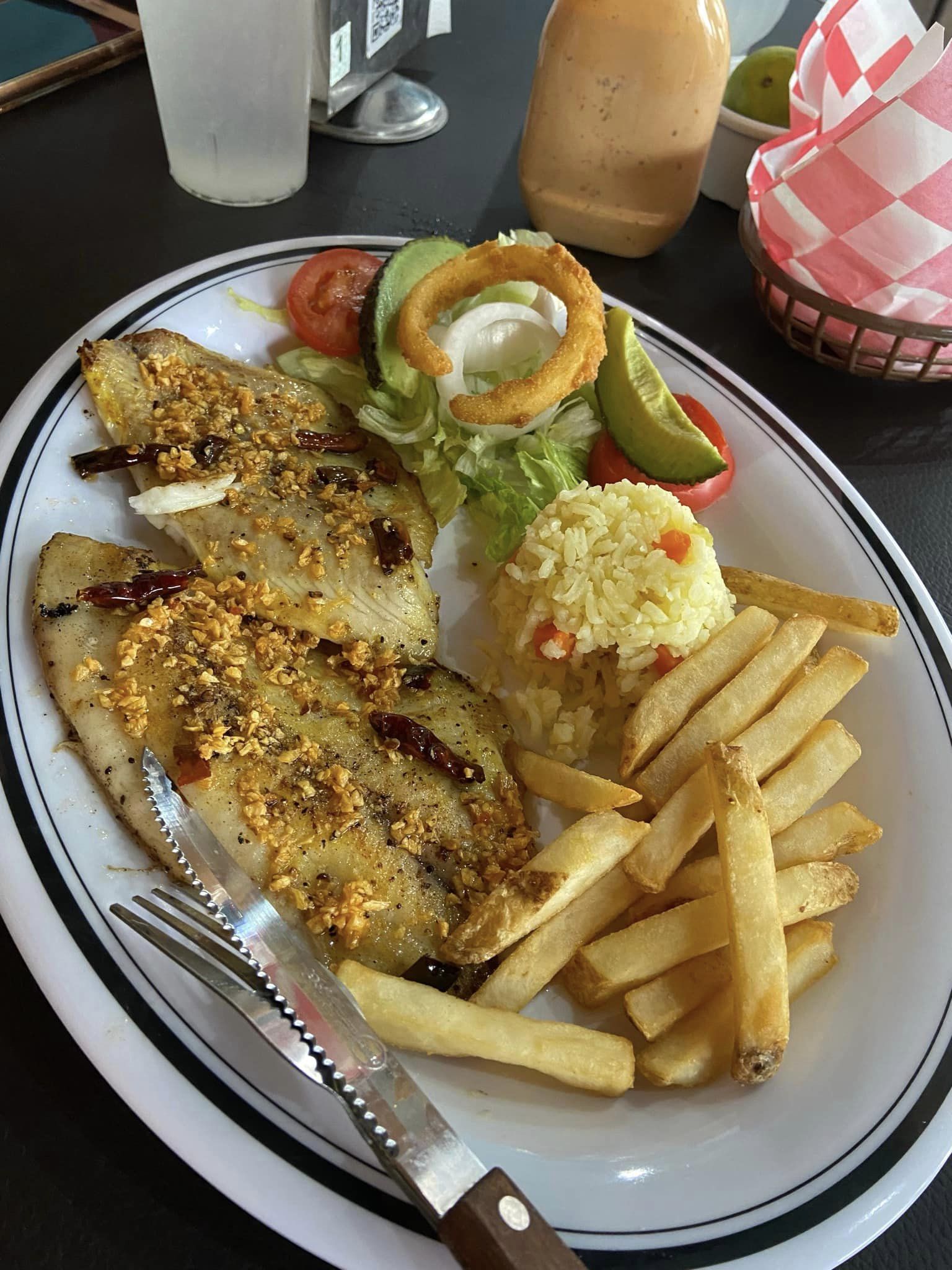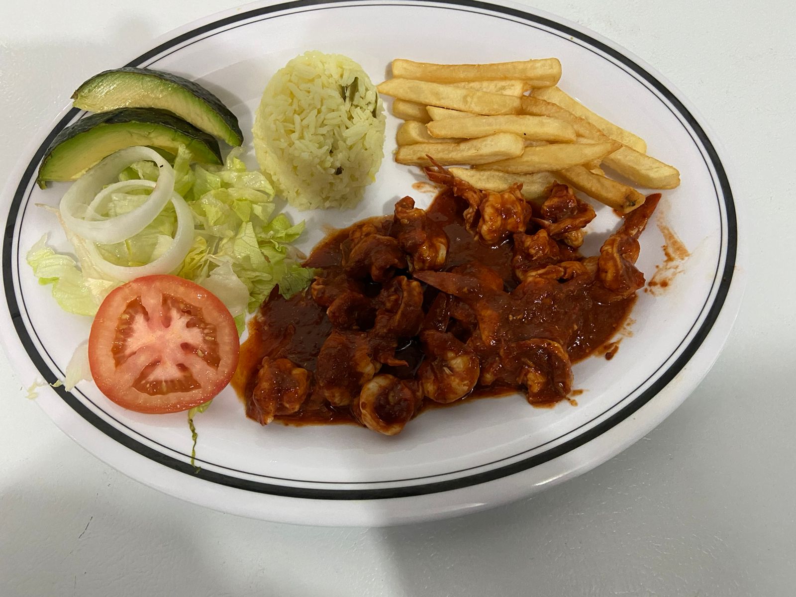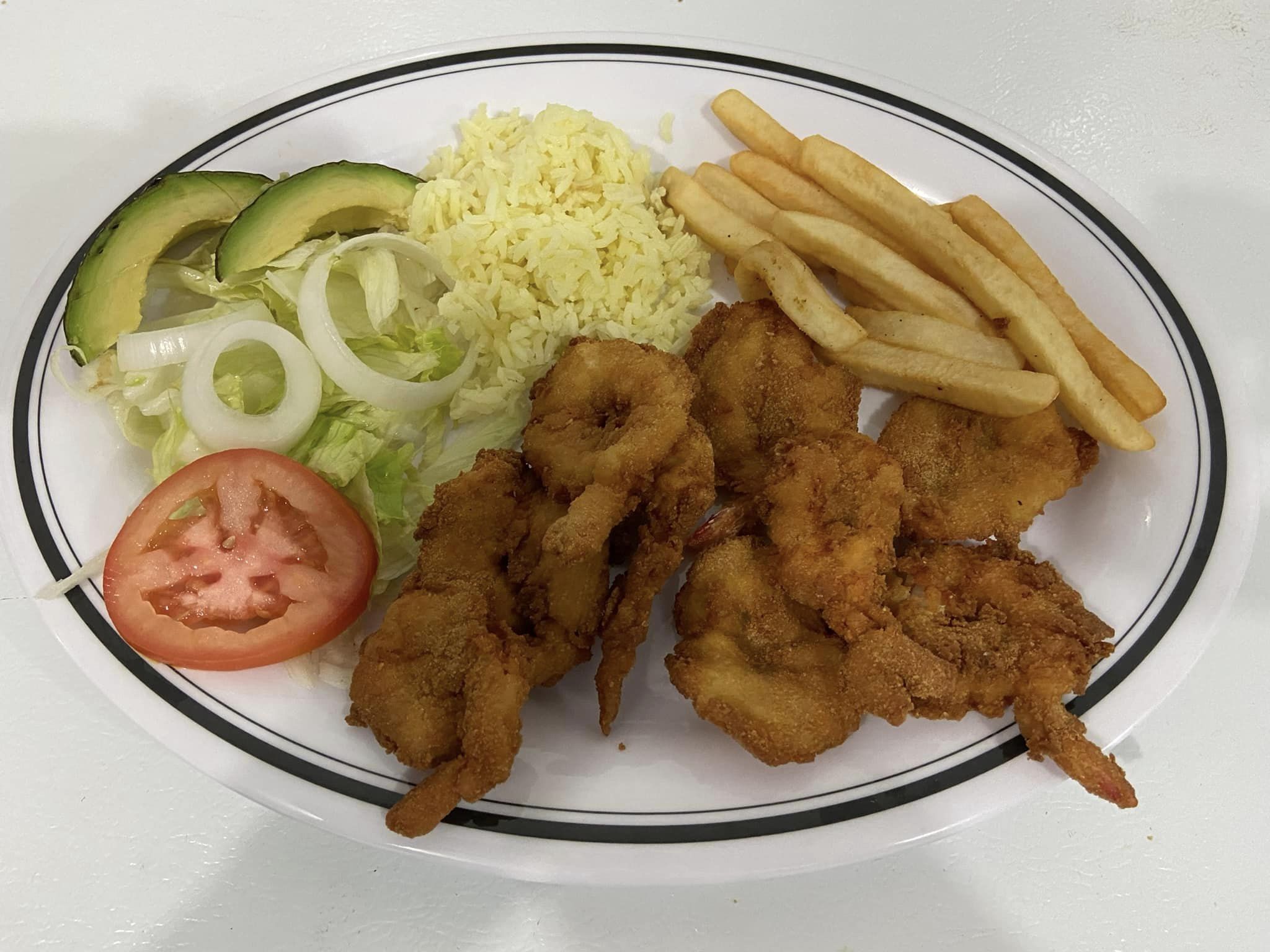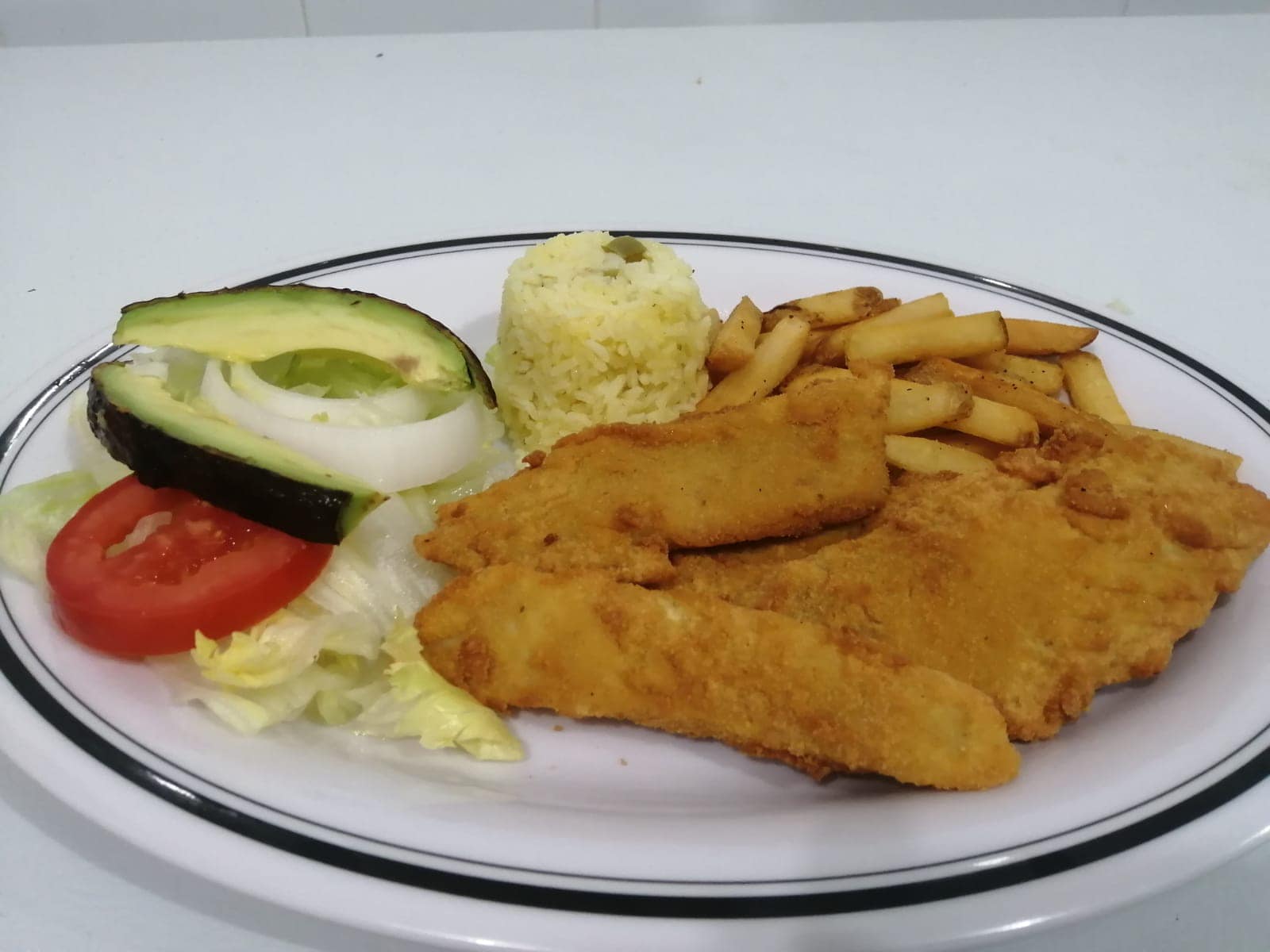 Acompañado de arroz y papas a la francesa.