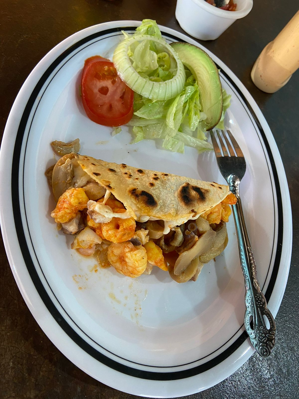 Con queso y guiso de camarón, acompañado de ensalada.