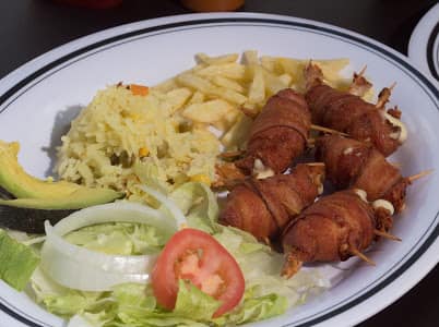 5 Camarones rellenos de queso envueltos en tocino.