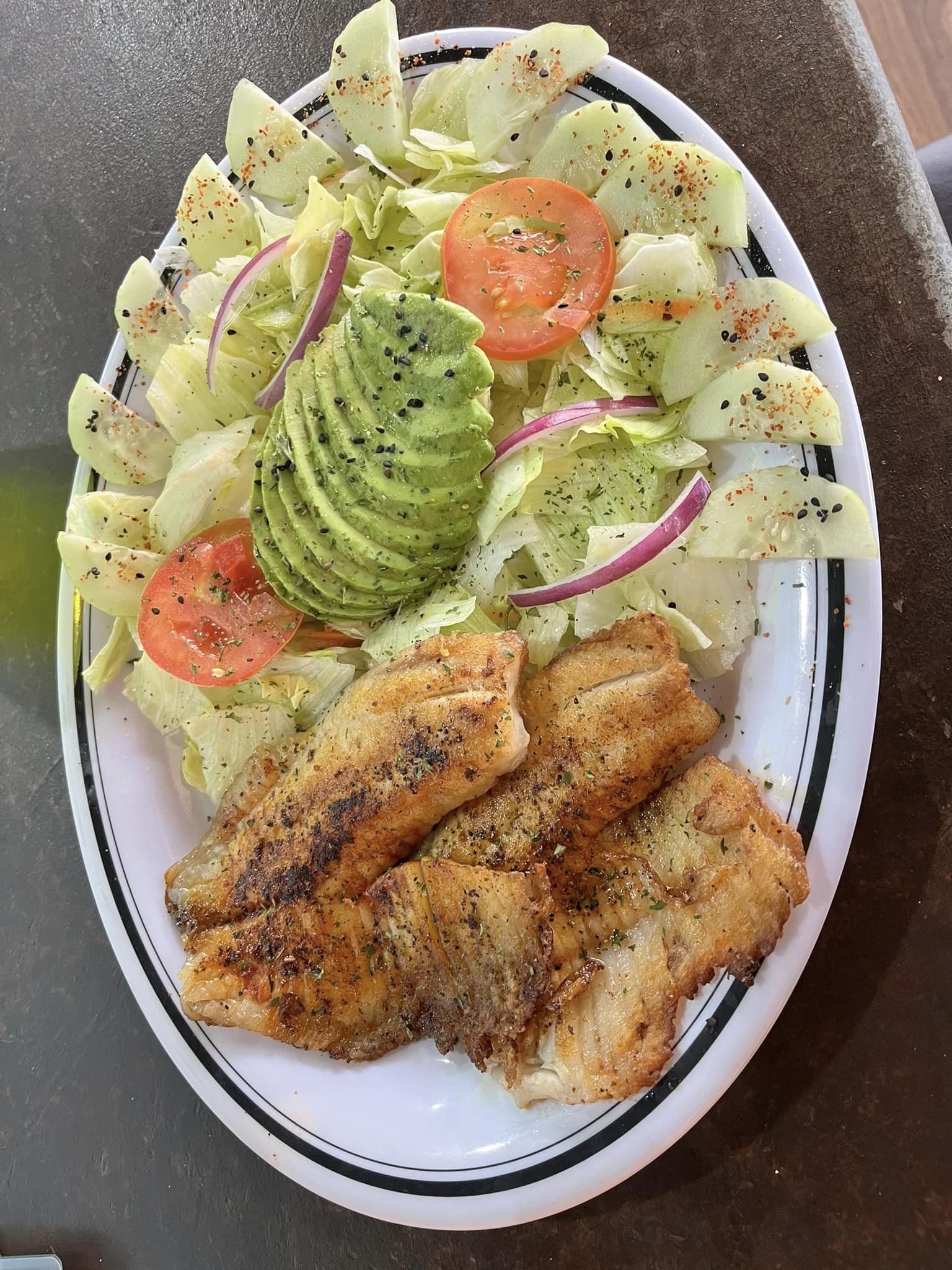 100 gr De filete, 40 gr de camarón, 100 gr de postas de pescado acompañado de arroz, papas a la francesa y ensalada.