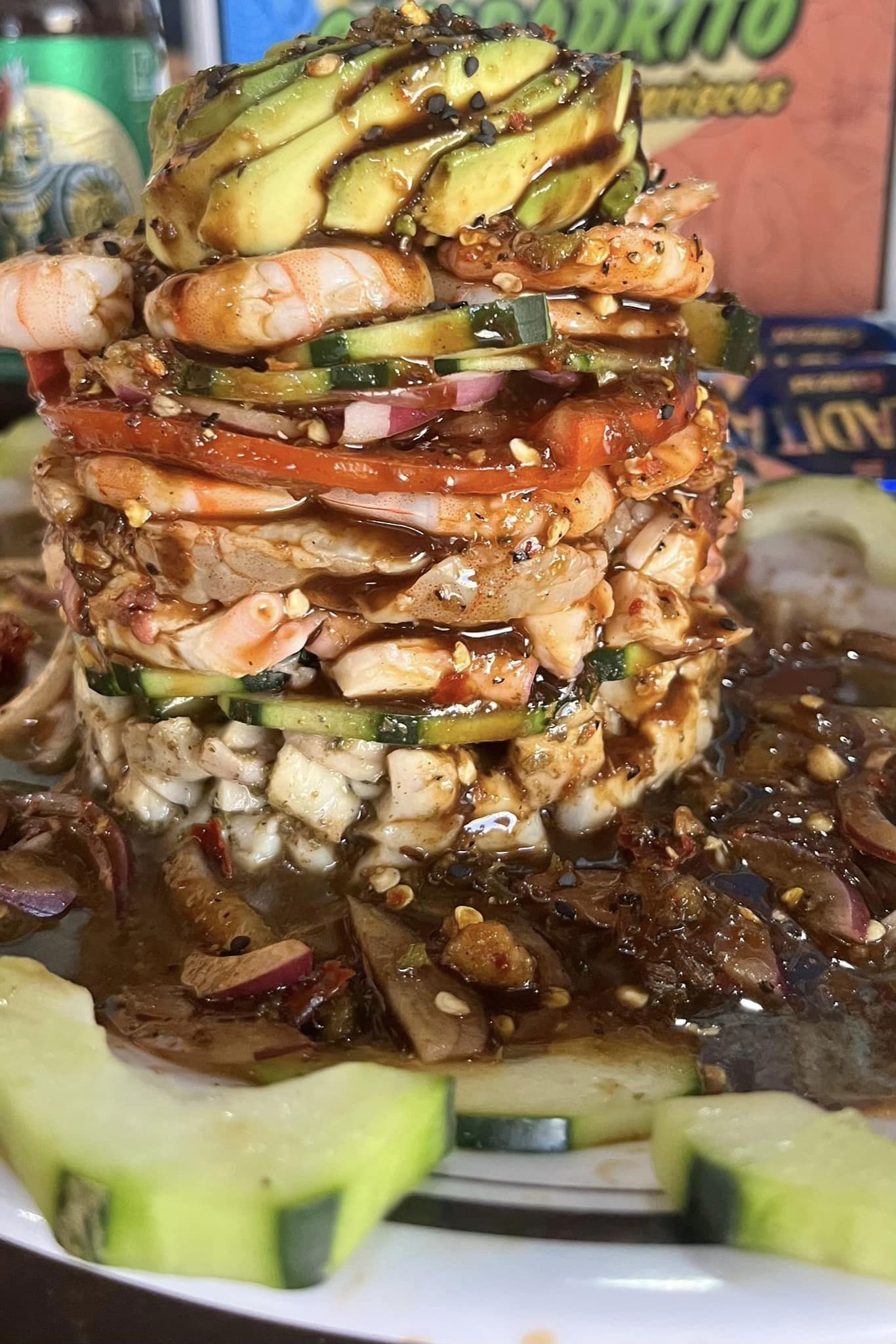 Camarón, pulpo y tomate, cubierta de aguacate.
