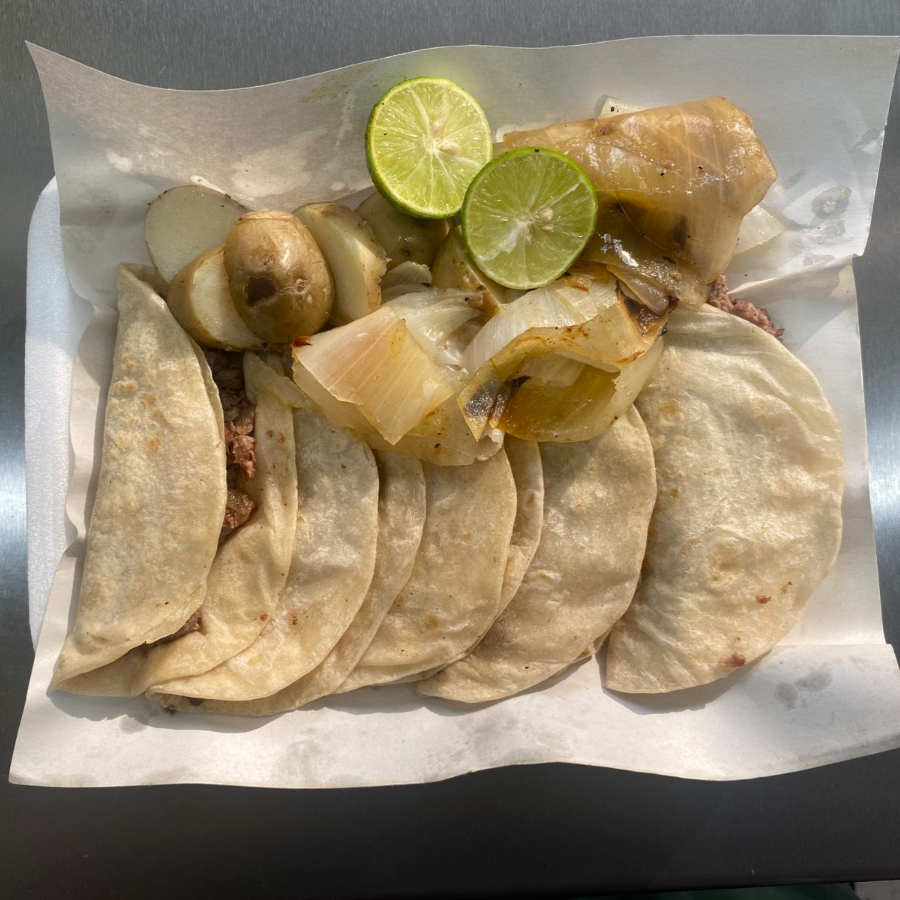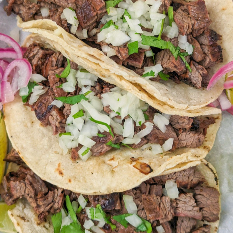 5 tacos de carne asada al carbón. Incluye papitas de Galeana y cebolla asada.