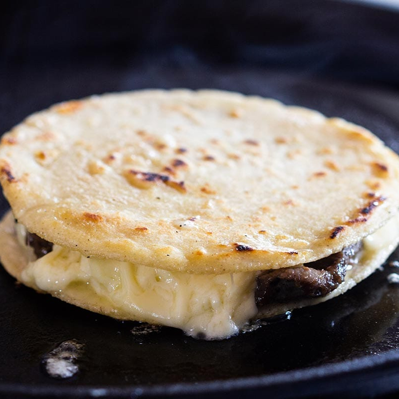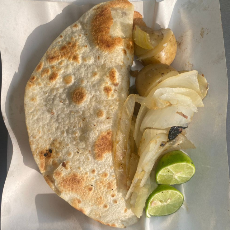 Tortilla de harina mediana con carne asada y queso. Acompañada de papitas y cebolla asada.