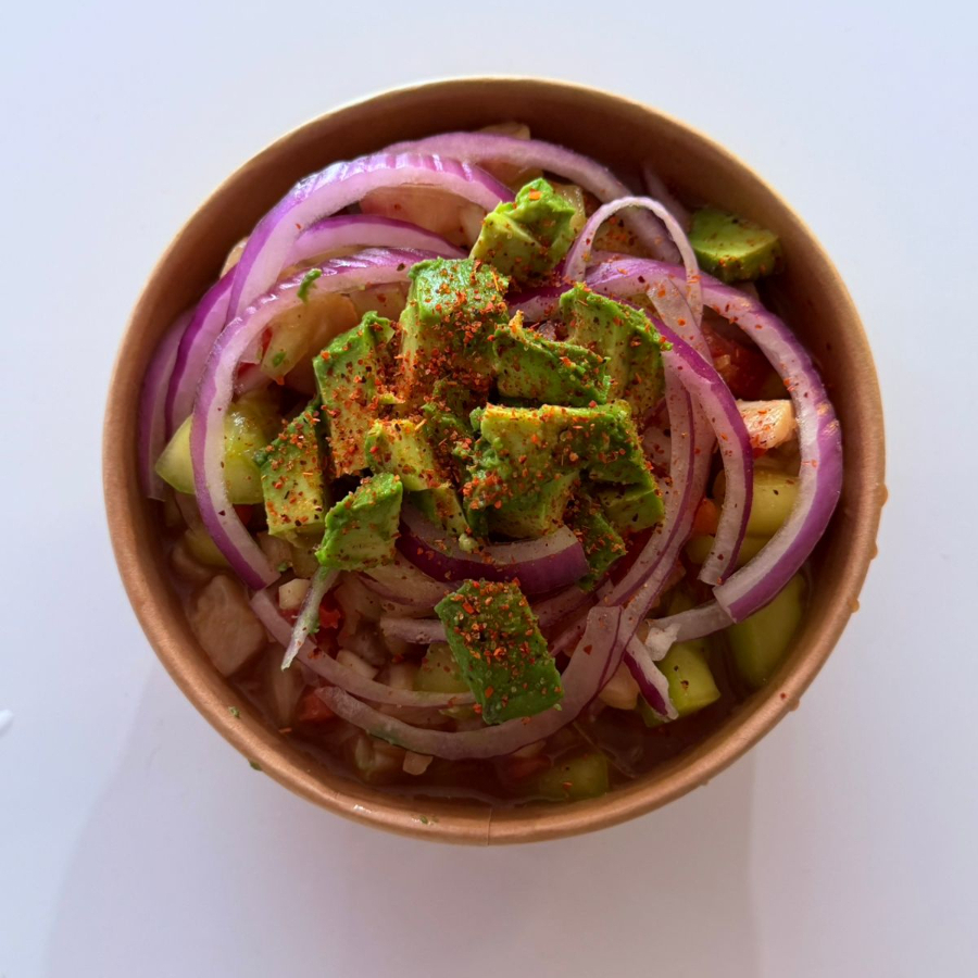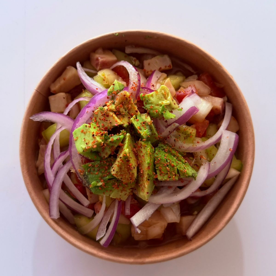 Refrescante ceviche de pescado fresco marinado en jugo de limón, mezclado con cebolla morada, pepino, cilantro y un toque de sal.