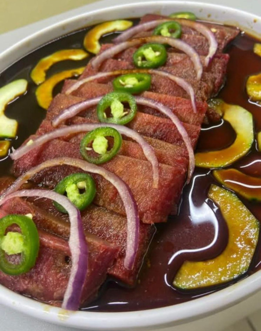 Láminas finas de atún fresco de primera calidad, bañadas en una salsa cítrica especial con un toque de chile.
