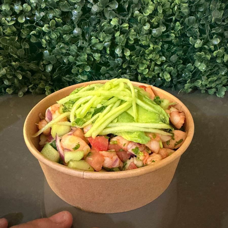 Deliciosos camarones cocidos en su punto, marinados con cítricos, acompañados de tomate, cebolla, pepino y cilantro fresco.
