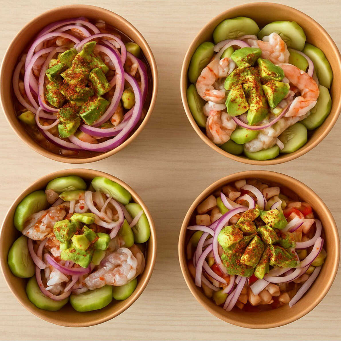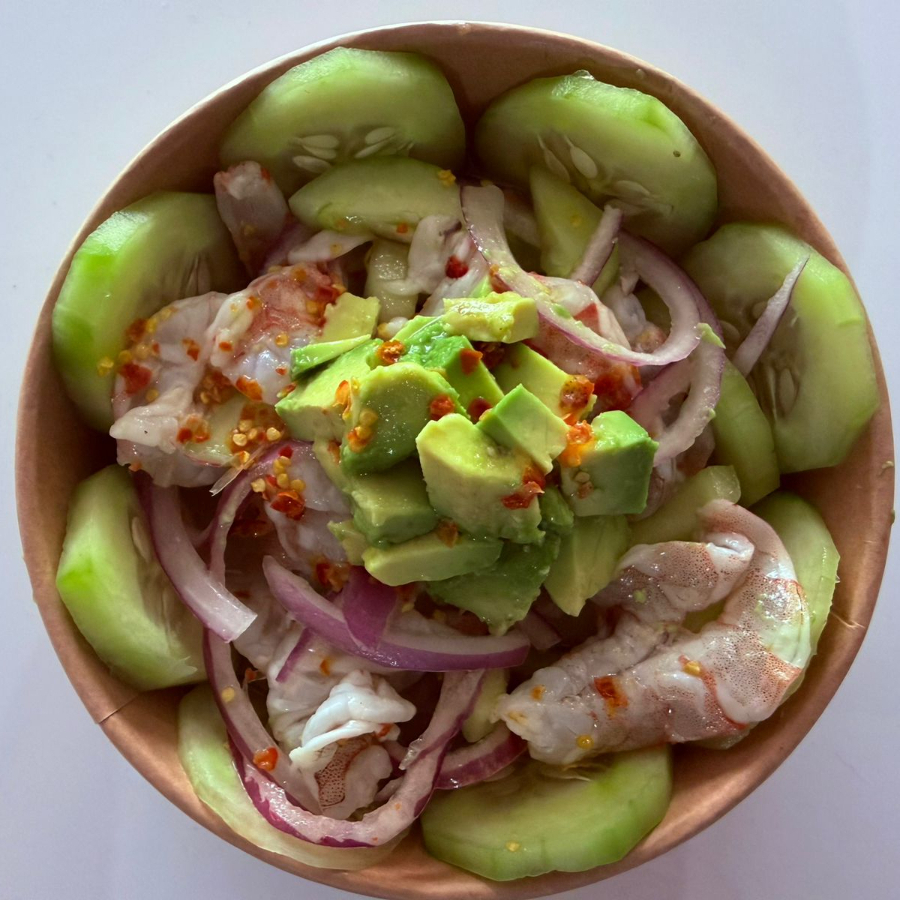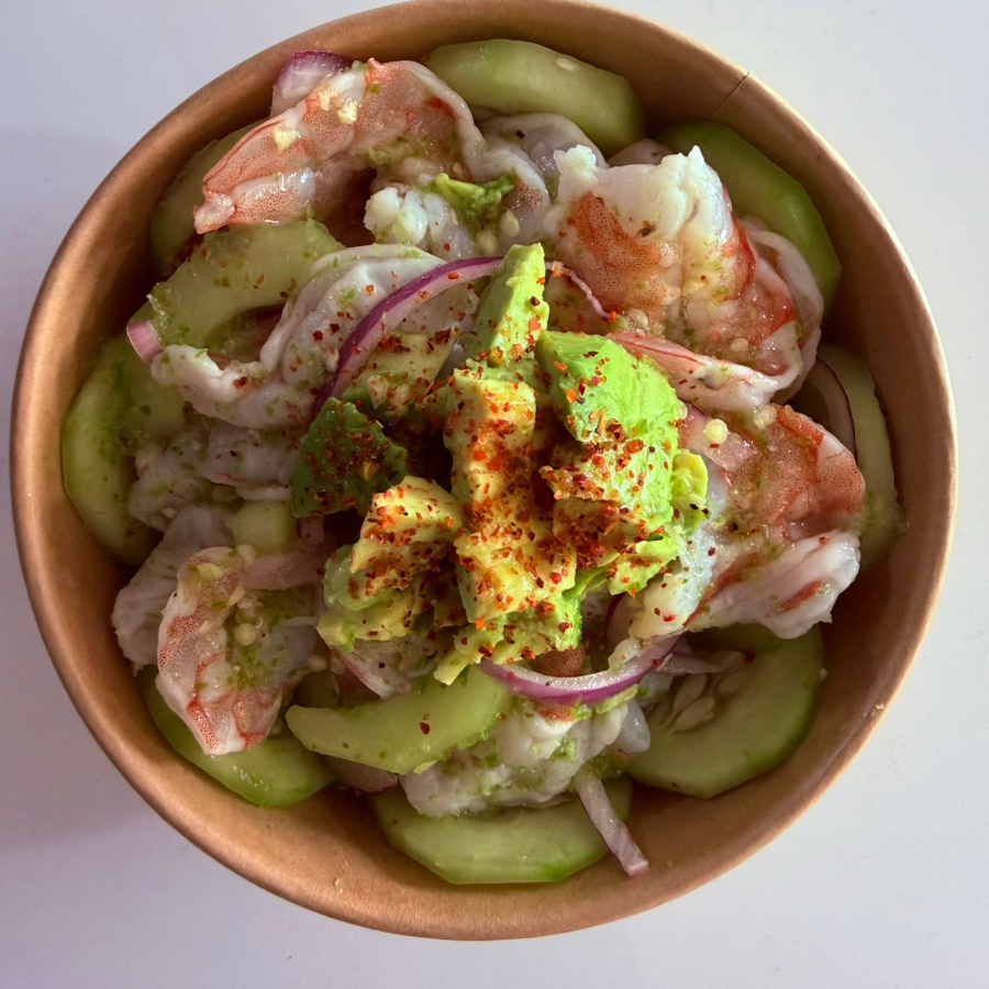 Camarones frescos marinados en una picante y vibrante salsa de chile chiltepín con limón, cebolla morada y pepino.