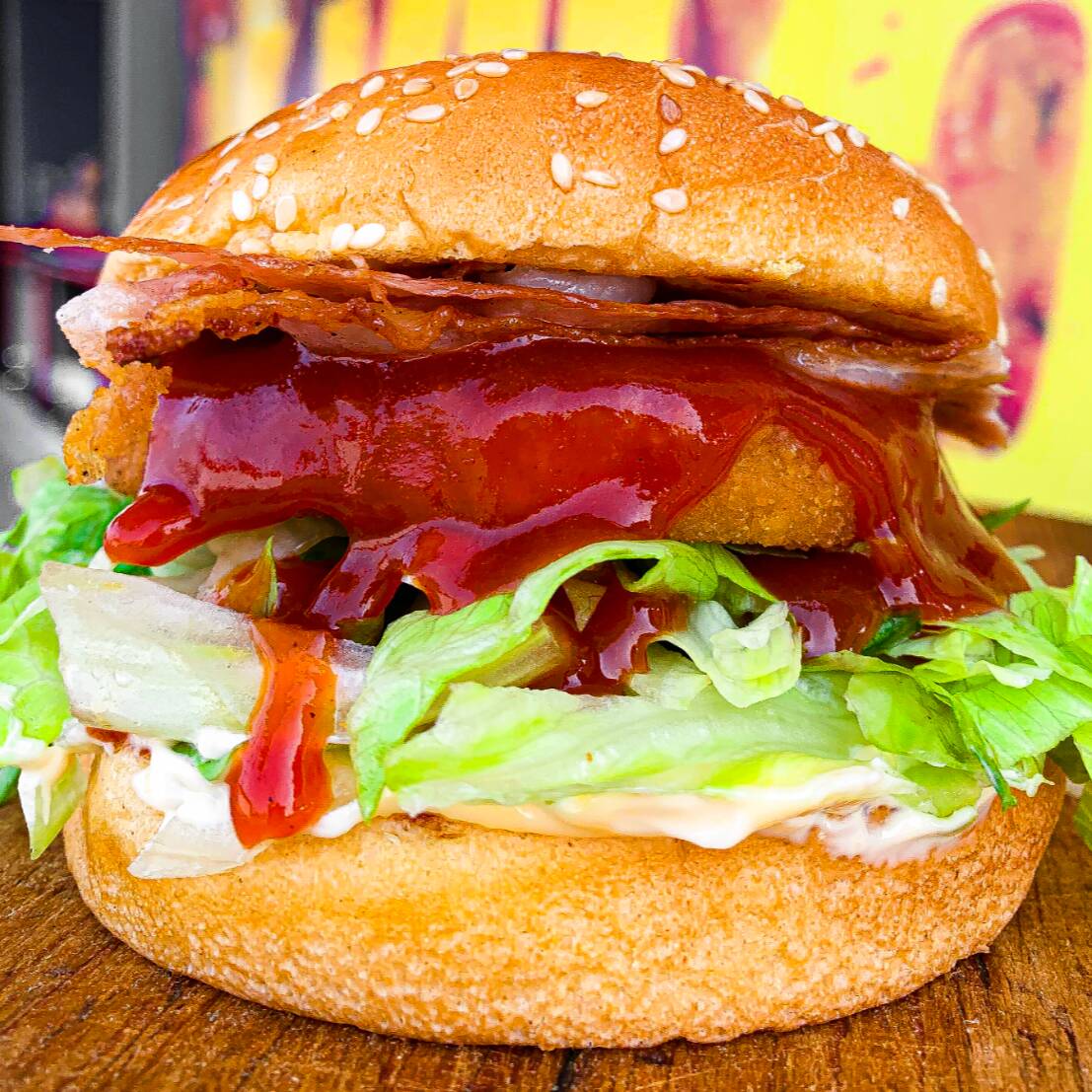 Deliciosa pechuga de pollo bañada en salsa bufalo con rebanda de tocino sobre una cama de lechuga fresca en pan brioche.