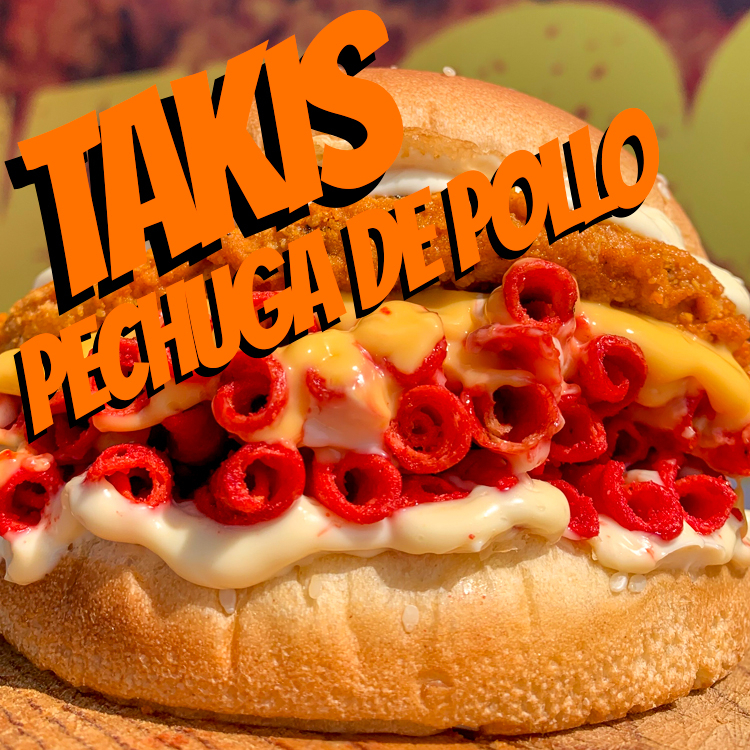 El sabor que te encanta de los takis ahora en una burger de pollo, lleva muchos takis con queso amarillo arriba la pechuga de pollo, pidela solo si soportas el sabor picante🔥⚡