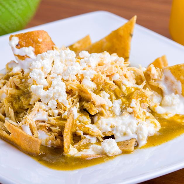 Totopos recién hechos bañados de salsa verde, con crema, aguacate y queso mozzarela.