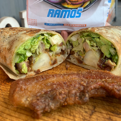 Delicioso Burrito de Harina con Aguacate, lechuga picadita, salsa verde y un puño de chicharrón de la Ramos Picadito, de verdad que será uno de tus favoritos.