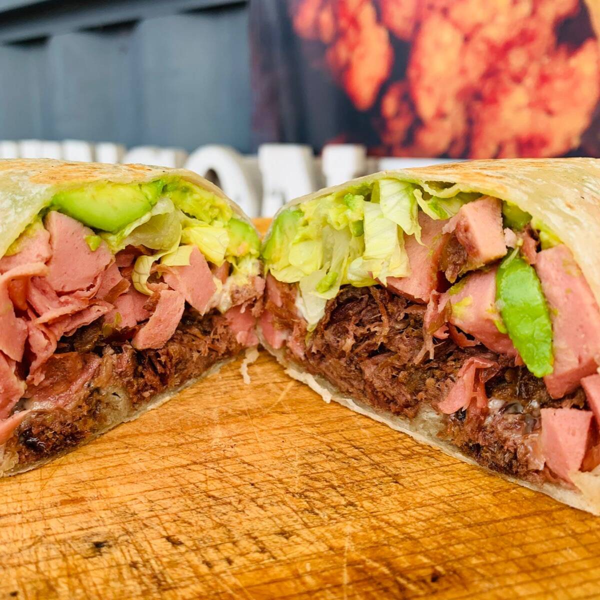 Imagina que comerás un burrote de pollo crujiente con papas fritas, aguacate, lechuga, bañado de salsa ranch habanero en tortilla de harina doradita.