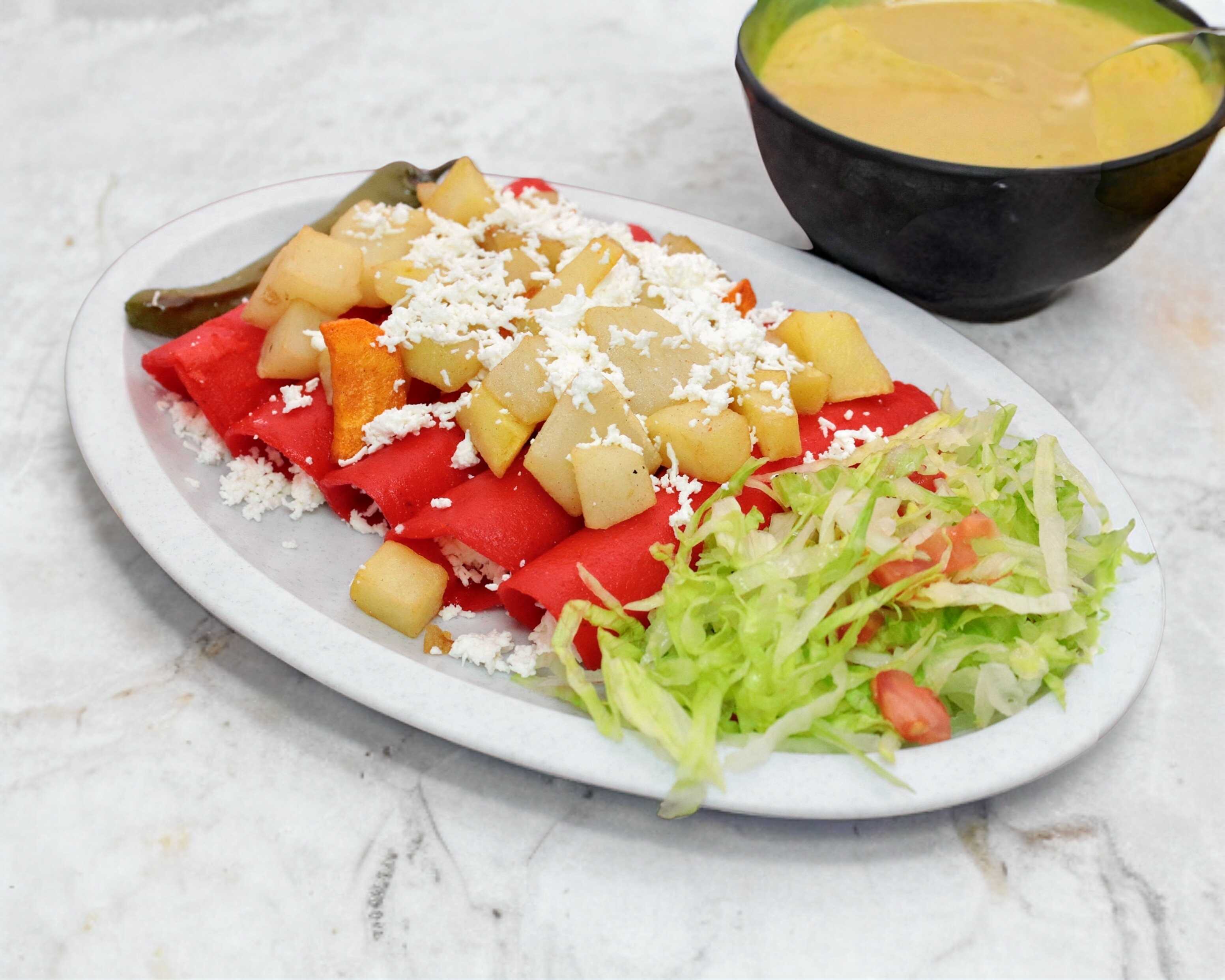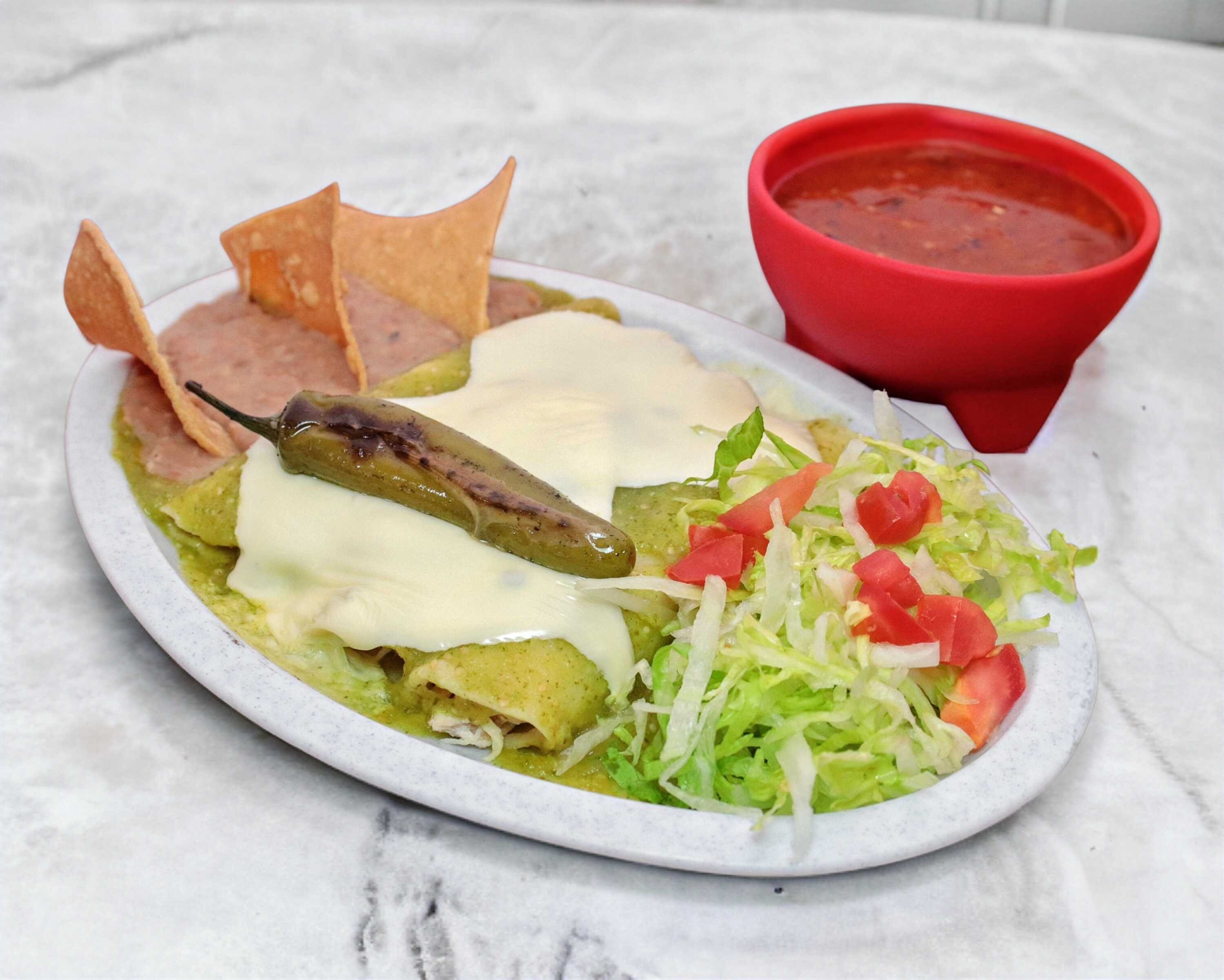 Acompañadas de frijoles refritos y lechuga.