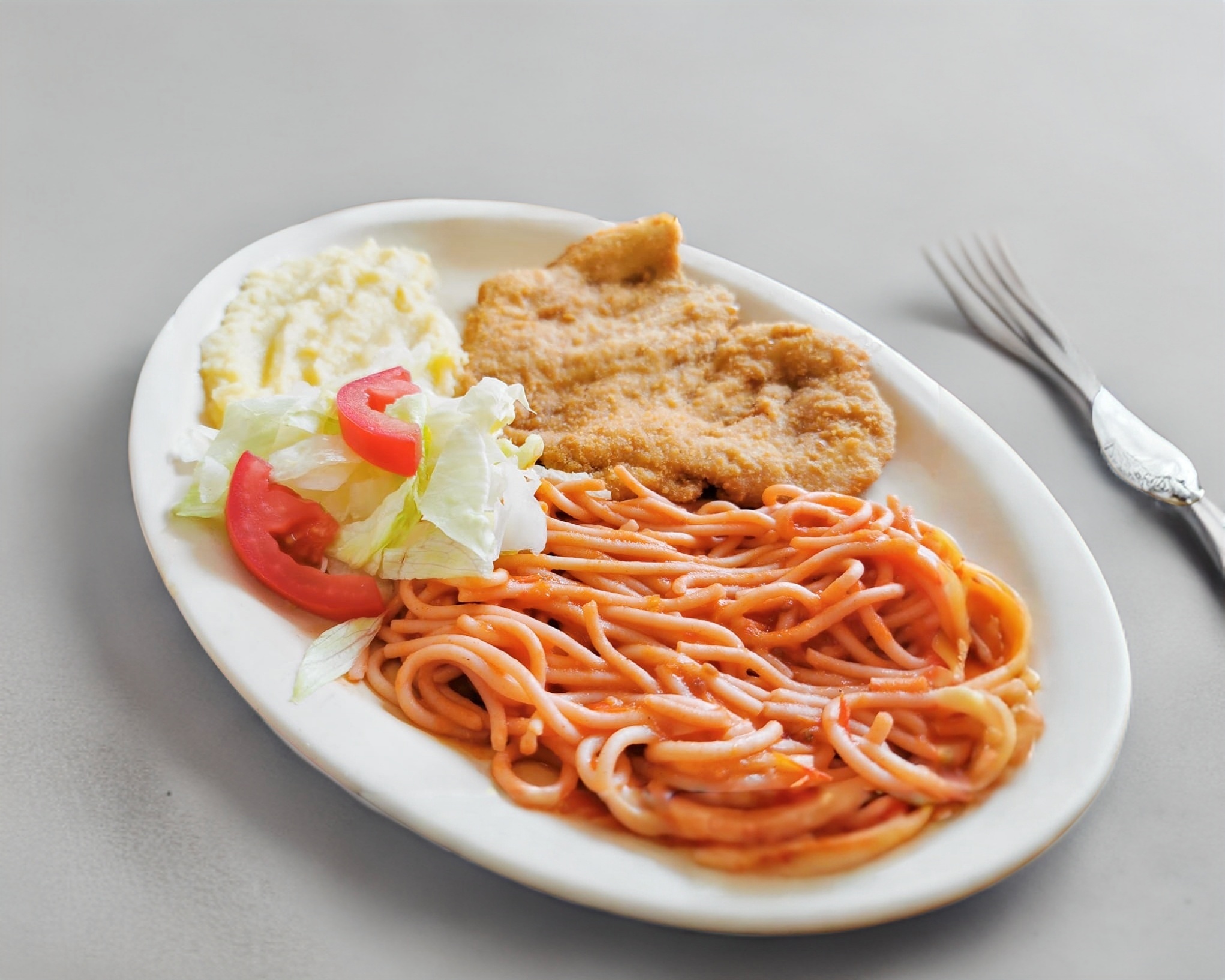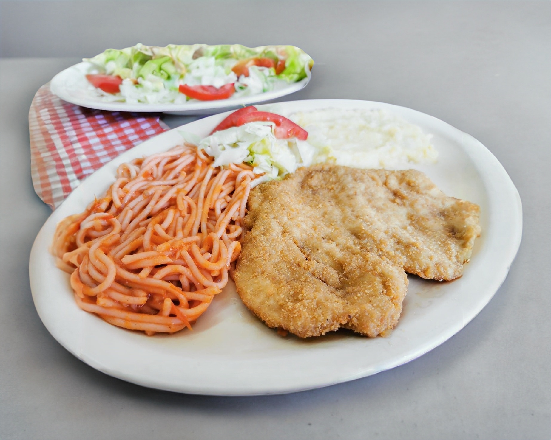 Milanesa de pollo casera empanizada, con 2 guarniciones a escoger, incluye 4 tortillas, salsa verde, limón, lechuga, tomate y cubiertos