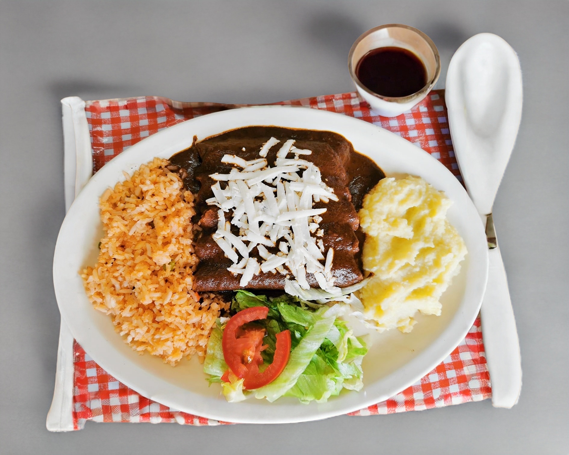 3 rollitos de pollo en salsa de mole con 2 guarniciones a escoger, incluye salsa picosa y cubiertos