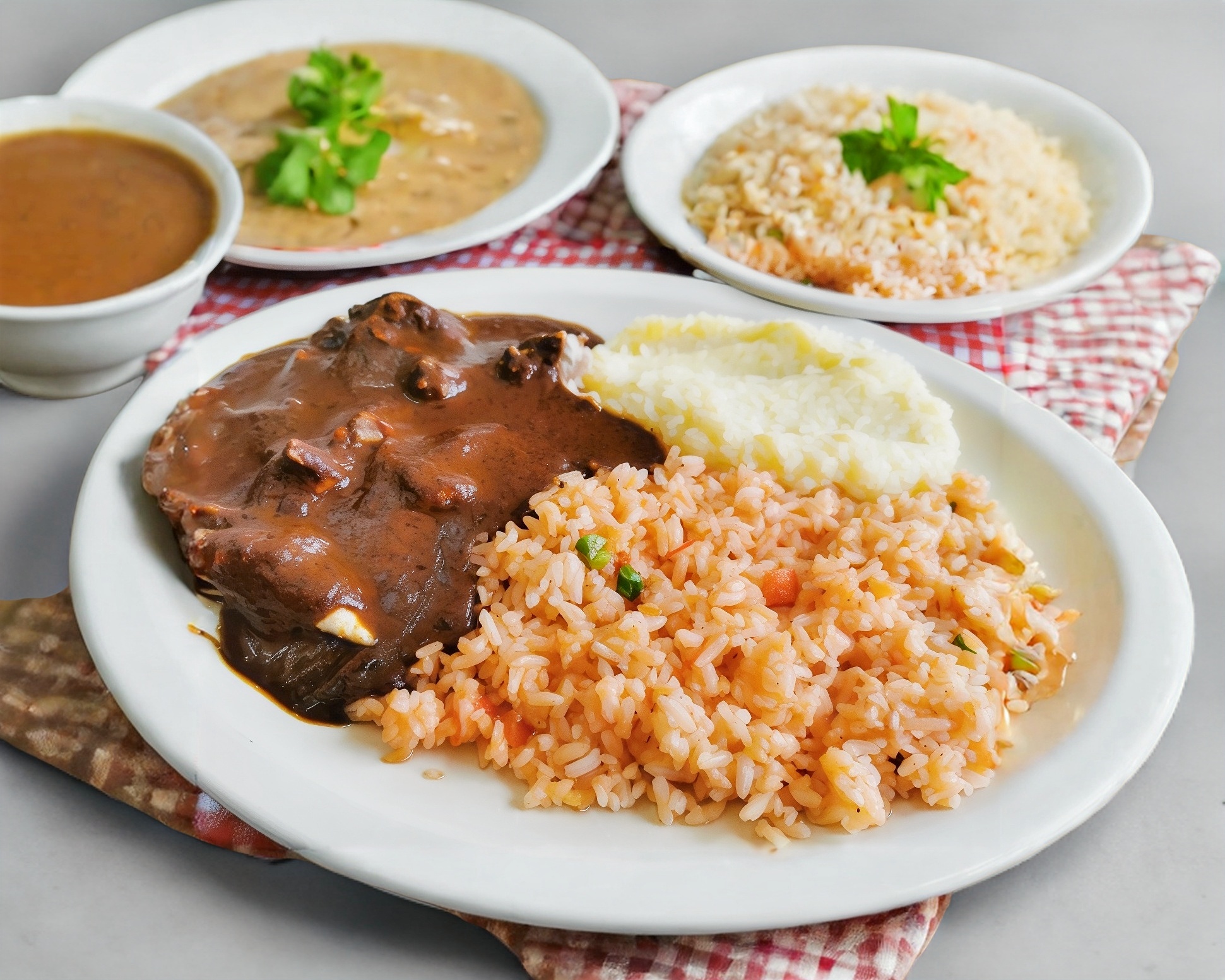Trocitos de pollo bañados en mole acompañado de 2 guarniciones a escoger, incluye tortillas, salsa picosa y cubiertos