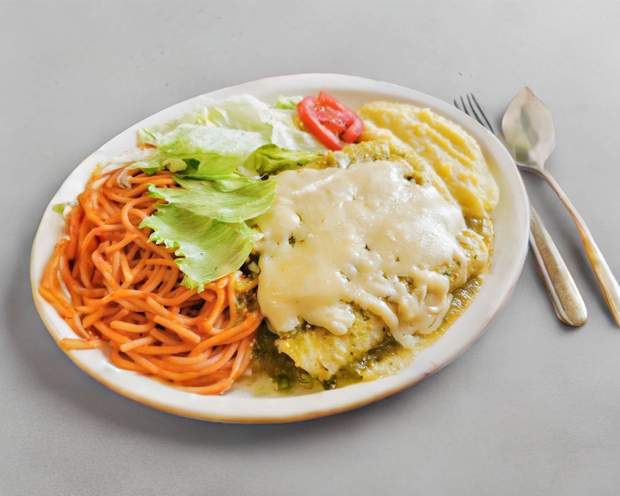 5 rollos de pollo bañados de salsa de tomate y queso panela con 2 guarniciones a escoger, incluye, salsa verde y cubiertos