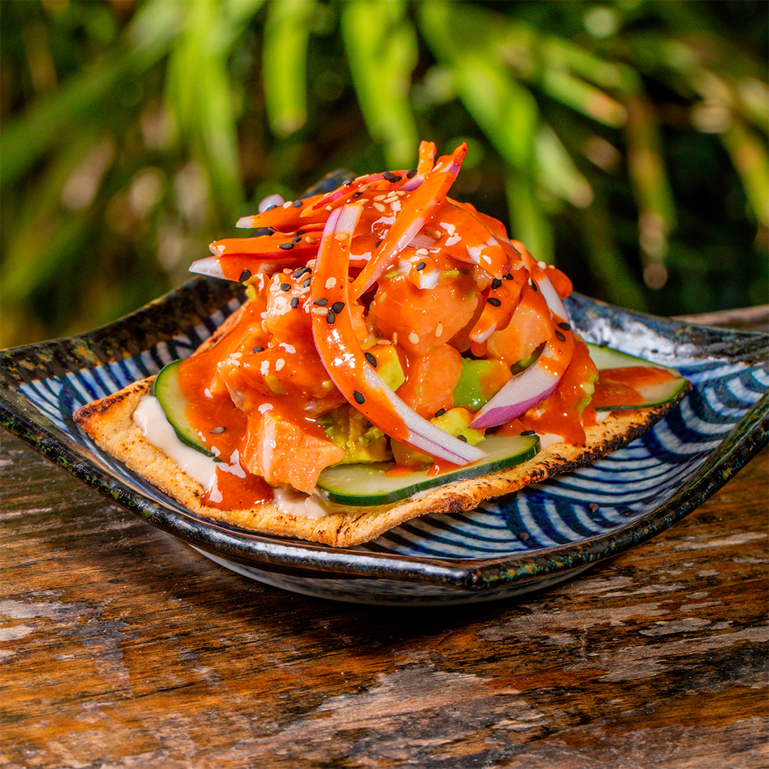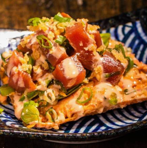 Tostada de wontón con paté de atún + cacahuate, con aguacate, panko y dados atún fresco bañados en salsa ánguila y chili oil