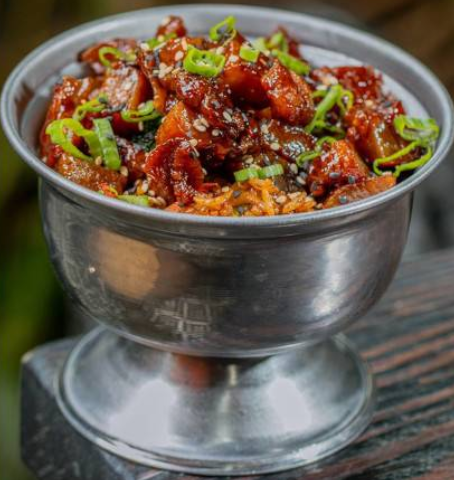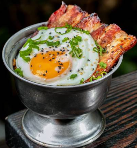 Arroz frito con pork belly ahumado, mix de verduras, huevo, cebollín y ajonjolí.