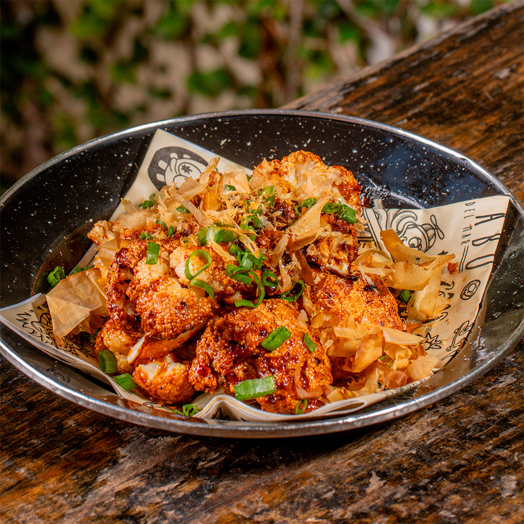 Coliflores fritas con aderezo de chili oil, salsa ponzu de ajos fritos y chile japonés, Con bonito flake y cebollín.