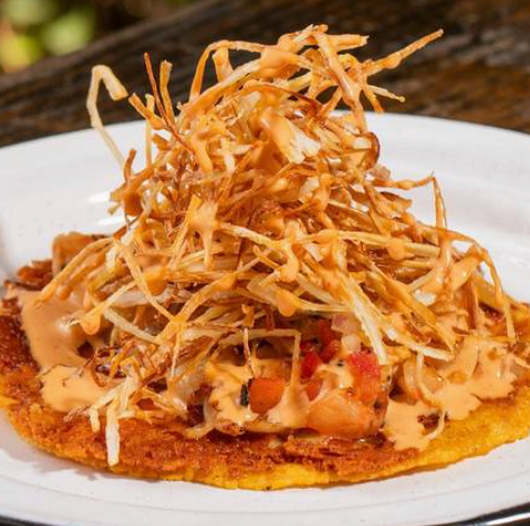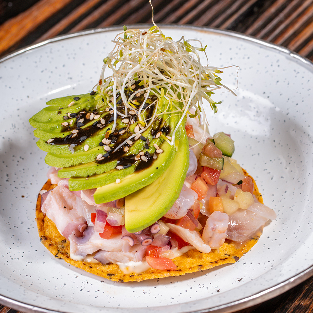 Tostada fresca con pulpo, ceviche de camarón y pescado, pico de gallo, jugos de la casa, aceites orientales y aguacate.