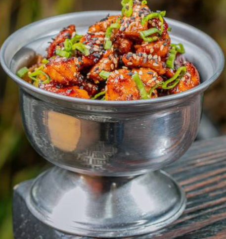 Arroz frito salteado en el wok con chicharrón glaseado, mix de verduras, huevo, cebollín y ajonjolí.