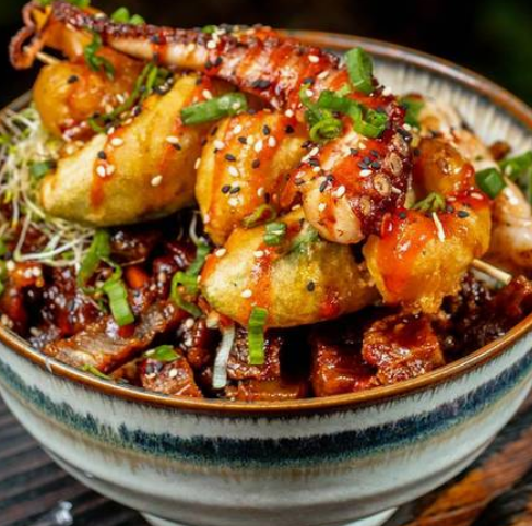 Con camarones a la plancha y chicharrón glaseado, mix de verduras, huevo, cebollín, ajonjolí, brocheta pulpo, aguac y camarón