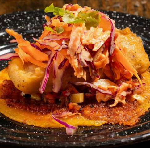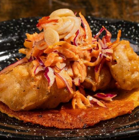 Taco de camarones capeados con costra de queso. Acompañado de ensalada de col, cebollitas encurtidas con chile morita.