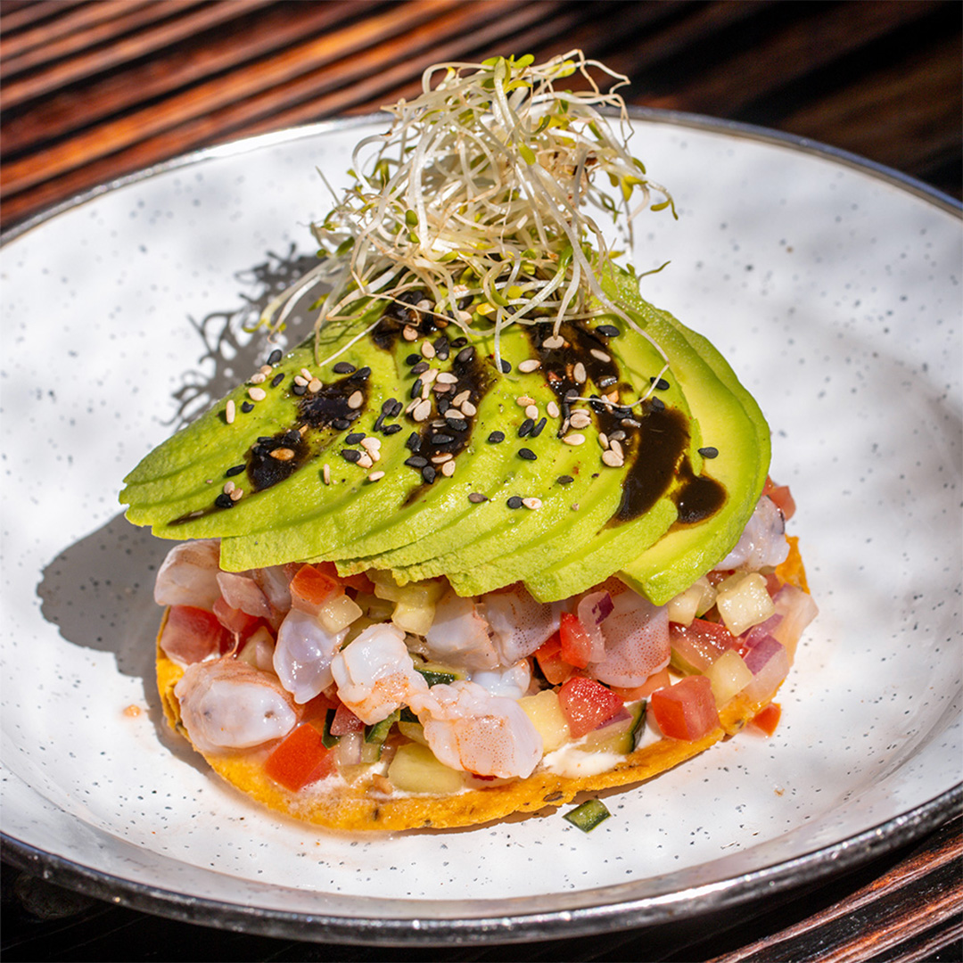 Tostada fresca con ceviche de camarón, pico de gallo, jugos de la casa, aceites orientales, germinado de alfalfa y aguacate.