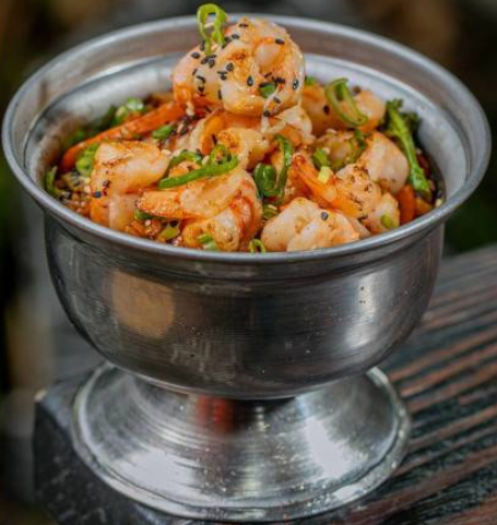 Arroz frito con camarones a la plancha y chicharrón glaseado, mix de verduras, huevo, cebollín y ajonjolí.