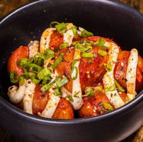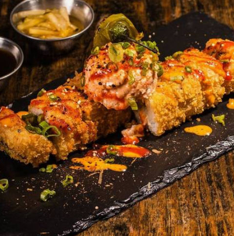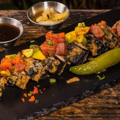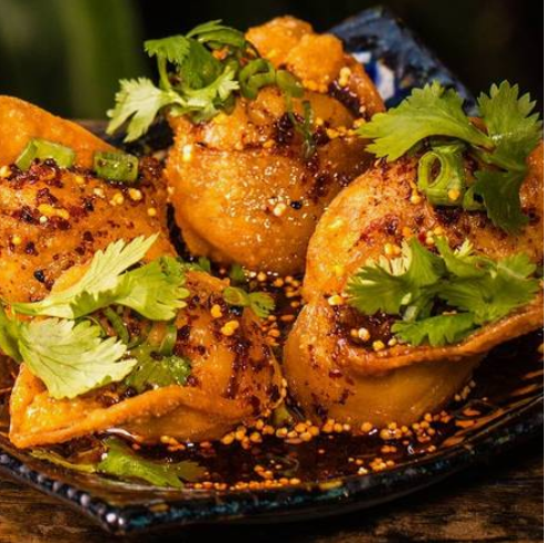 Wontons (5) fritos rellenos de camarón, ajo, col, jengibre y cebollín. Con salsa agridulce, chili oil, furikake, cebollín.