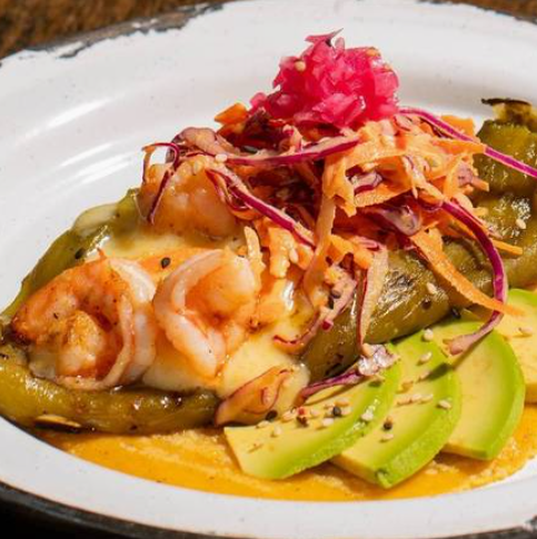 Taco con un chile chilaca tatemado, relleno de queso y camarones. Acompañado de aguacate, ensalada de col, xnipec y ajonjolí.