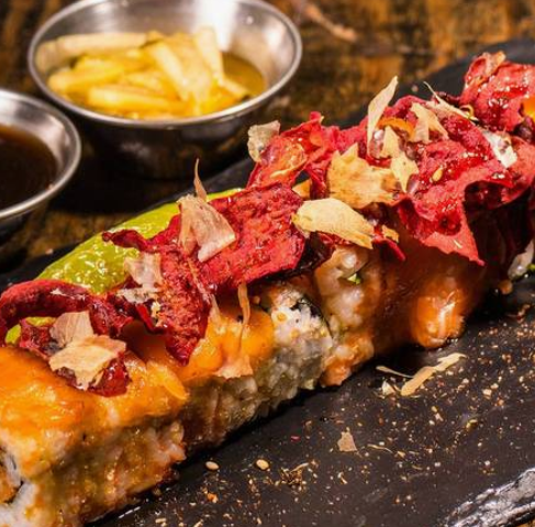 Rollo frío. Por dentro, camarón frito, queso crema y cilantro. Por fuera, masago y salmón fresco con salsa de anguila.