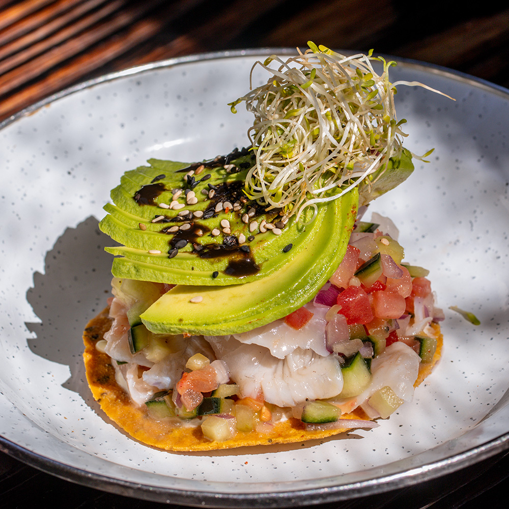 Tostada fresca con ceviche de pescado, pico de gallo, jugos de la casa, aceites orientales, germinado de alfalfay aguacate.