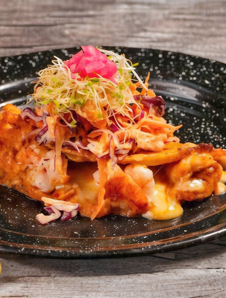 Arroz frito con camarones a la plancha y chicharrón glaseado, mix de verduras, huevo, cebollín y ajonjolí.