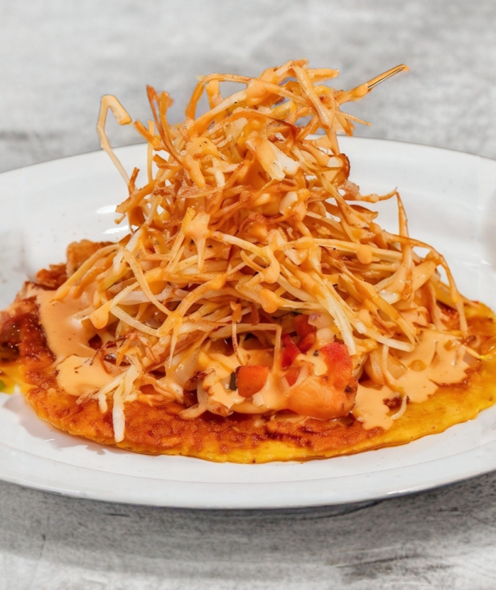 Taco de maíz azul con costra de queso por fuera, relleno de pulpo adobado. Con piña, cebolla morada, cilantro y salsa de chil
