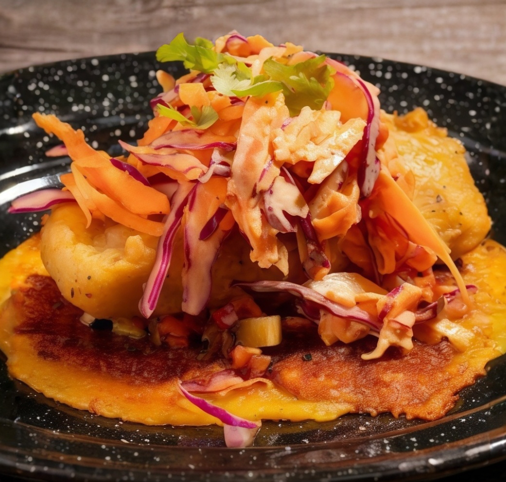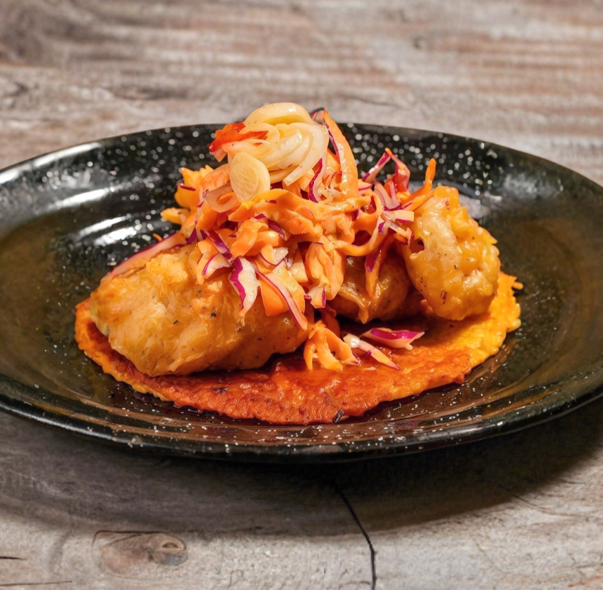 Taco de camarones capeados con costra de queso. Acompañado de ensalada de col, cebollitas encurtidas con chile morita.