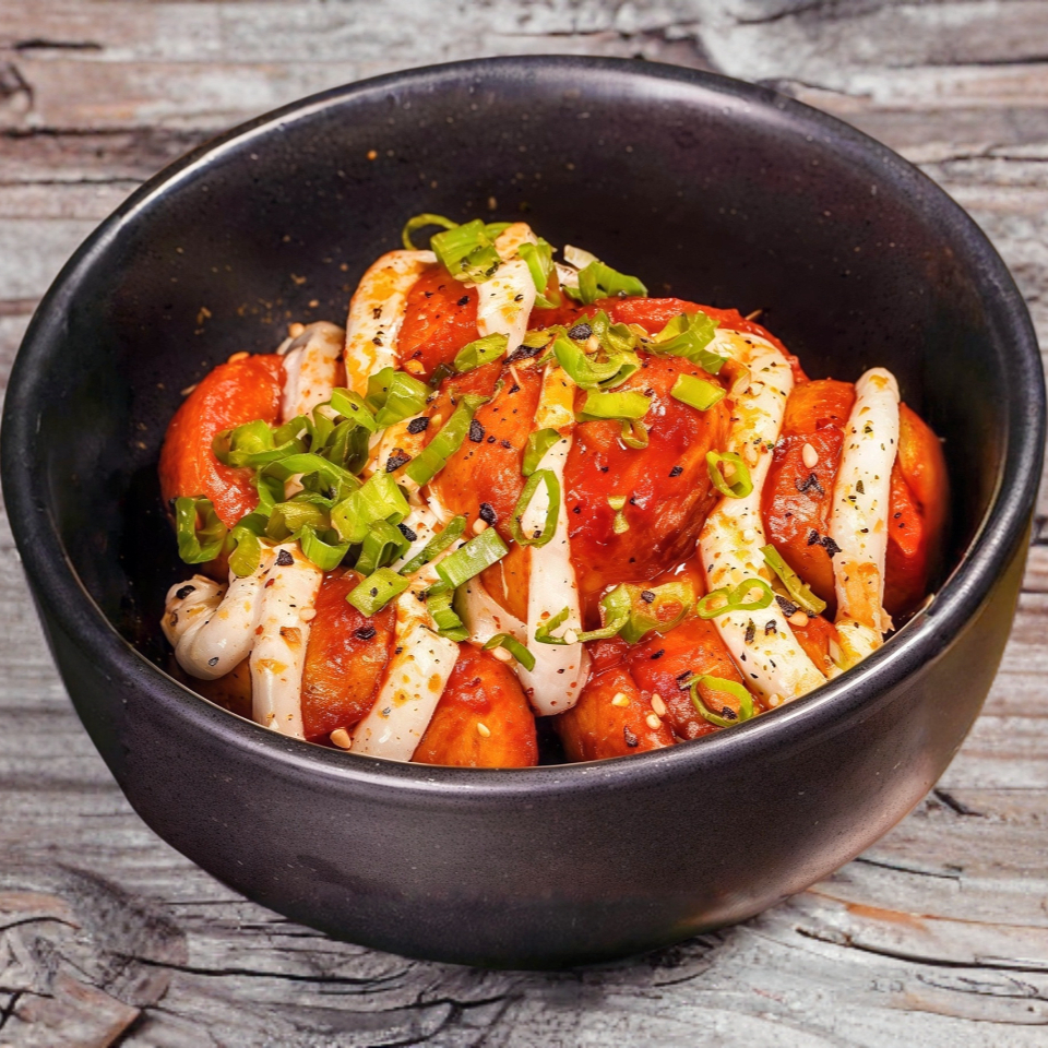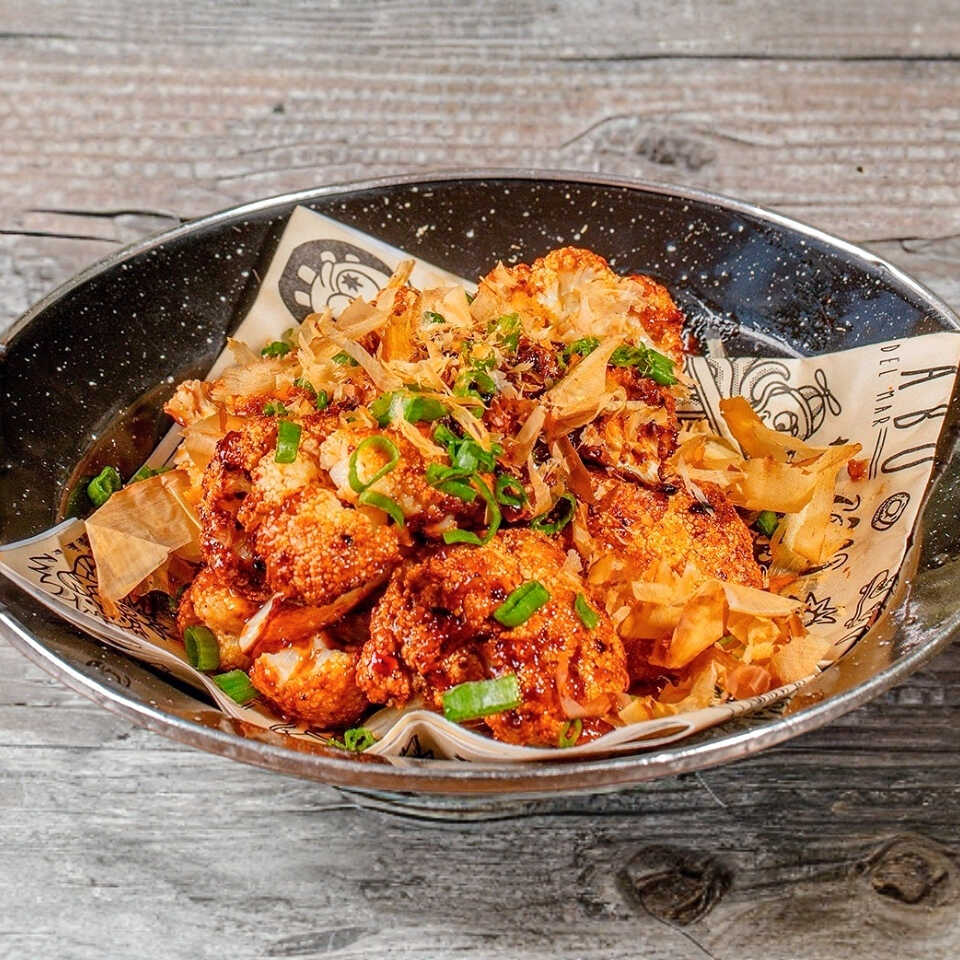 Wontons (5) fritos rellenos de camarón, ajo, col, jengibre y cebollín. Con salsa agridulce, chili oil, furikake, cebollín.