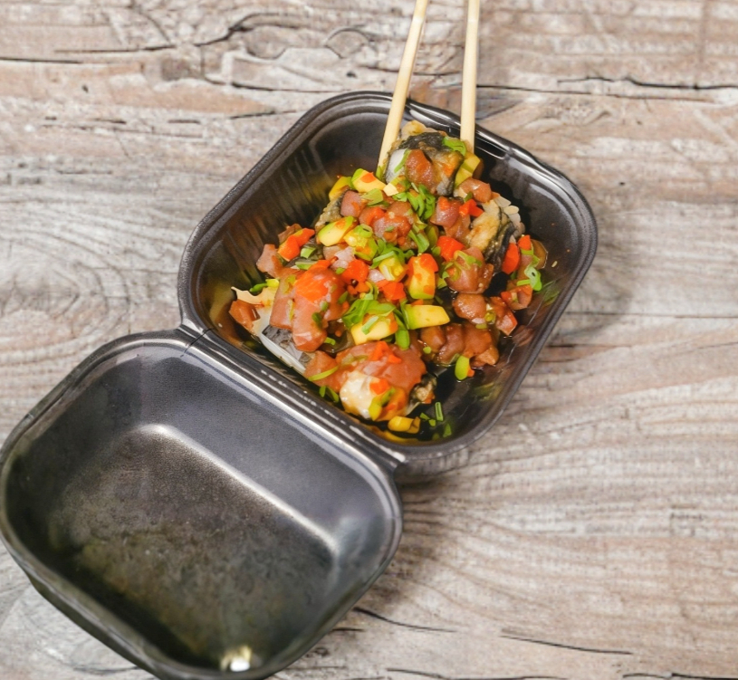 Arroz frito con pork belly ahumado, mix de verduras, huevo, cebollín y ajonjolí.