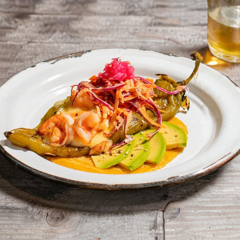 Taco con un chile chilaca tatemado, relleno de queso y camarones. Acompañado de aguacate, ensalada de col, xnipec y ajonjolí.